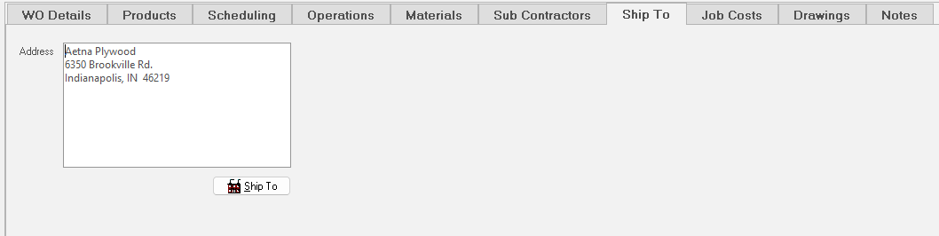 The seventh sub tab, “Ship To”, contains the work order’s “ship to” address. If the work order is being shipped to a different address than the overall Job or Job Item’s “ship to” address, enter the work order specific “ship to” address by clicking the “ShipTo” button and choosing a company. Alternatively, enter the address directly by typing into the ship to address memo box.