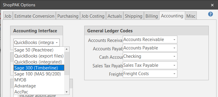 Choose corresponding GL account codes for the five default GL account codes listed. ShopPAK needs to know which GL account code represents ‘Accounts Receivables’, ‘Accounts Payable’, etc., so it can build interface records correctly.