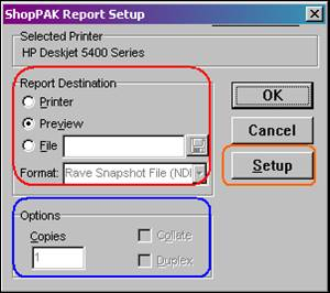 Once you have selected your filtering, option, and sort criteria, ShopPAK will display the “Report Setup” dialog box.