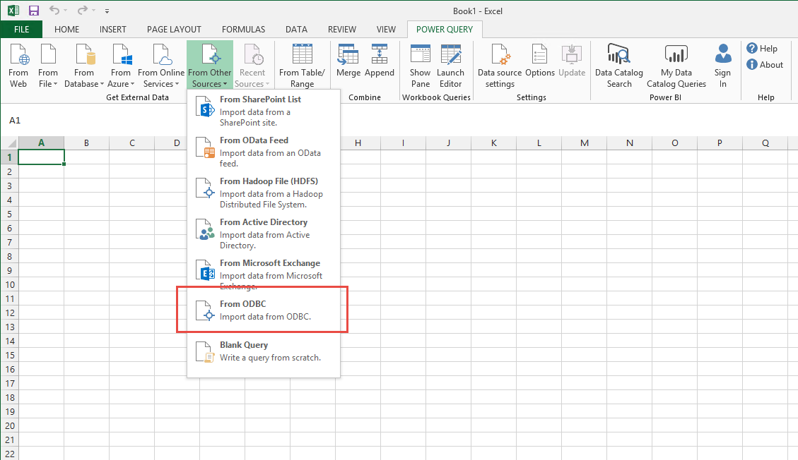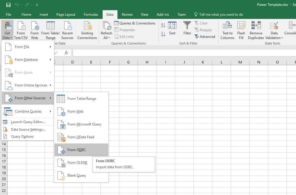 Open Excel and go to Power Query | From Other Sources | From ODBC.
