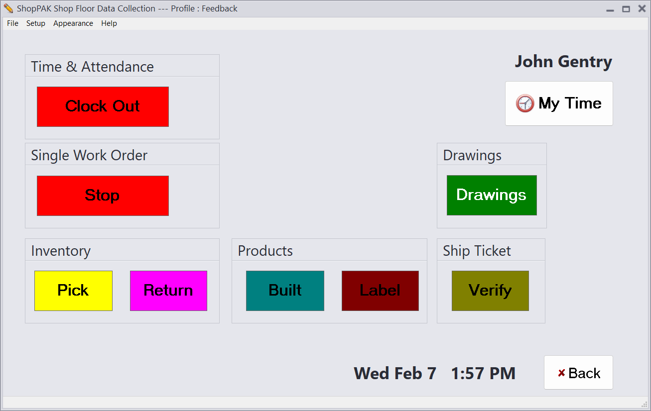 In the example below, we show the screen that displays when using the “Feedback” approach. When John Gentry selects his name from the “Employee List” window, ShopPAK looks to see if he has started a prior labor transaction. If so, a red labor button appears within the “Work Orders” group that says “Stop”. Tim can’t start a new work order until he has stopped the one he is currently working on.