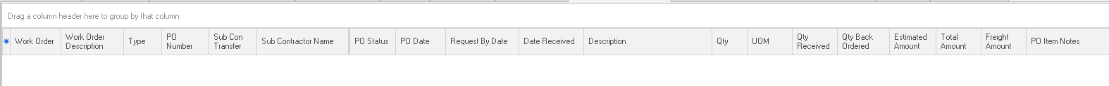 The seventh sub tab, “Sub Contractors”, lists all of the sub contractor purchase orders associated with the job. This is a read only grid, with the exception of PO Item notes. You can add or alter PO Item notes by selecting a row and clicking the PO Item Notes button.