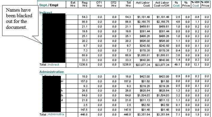 Running a work order “Labor Actuals” Department / Employee Summary lets you see indirect time by employee.