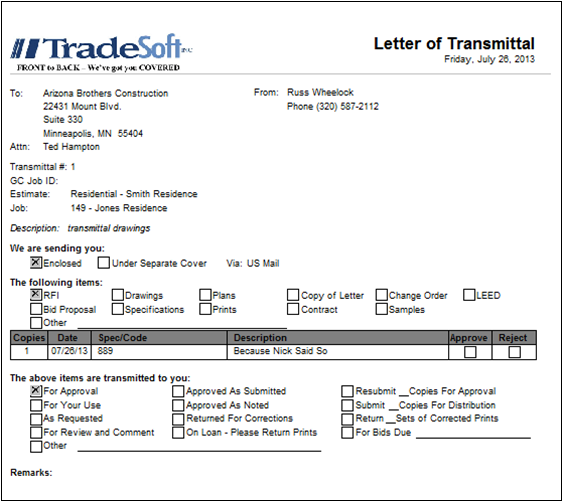 Transmittals Document You can generate a Transmittals document by either clicking one of the Preview or Print buttons or by right-clicking the Transmittals Grid and selecting “Preview” or “Print” from the pop up menu.