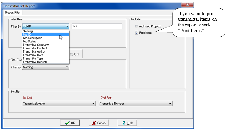 The transmittal report is handy when you want to see transmittals that span several jobs. (The Transmittals grid only shows transmittals for the job selected in the Job Tree).