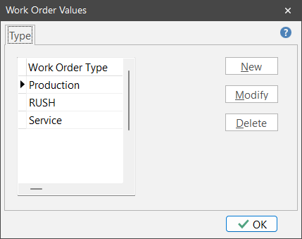 Use work order type to categorize different kinds of work orders. Note: ShopPAK already identifies ‘Original Bid’, ‘Change Order’, and ‘Rework’ via the work order “Purpose” pick list. Use work order type for any additional categorization you need.